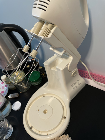 6. 低筋麵粉 1 杯,分數次篩麵粉加入攪拌機(攪伴)